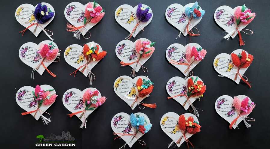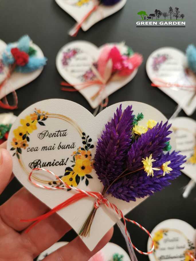 Inima masoara 8.5 cm si este infrumusetata de un buchet format din plante uscate si stabilizate. Martisoarele vin ambalate in cutii individuale cu fereastra.
