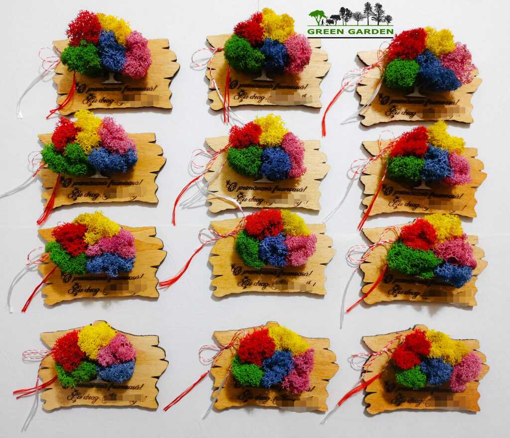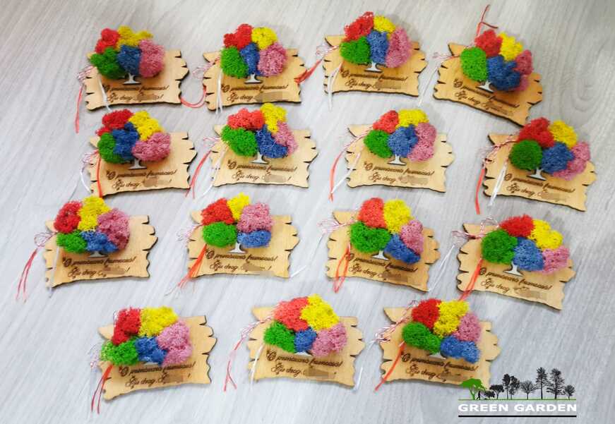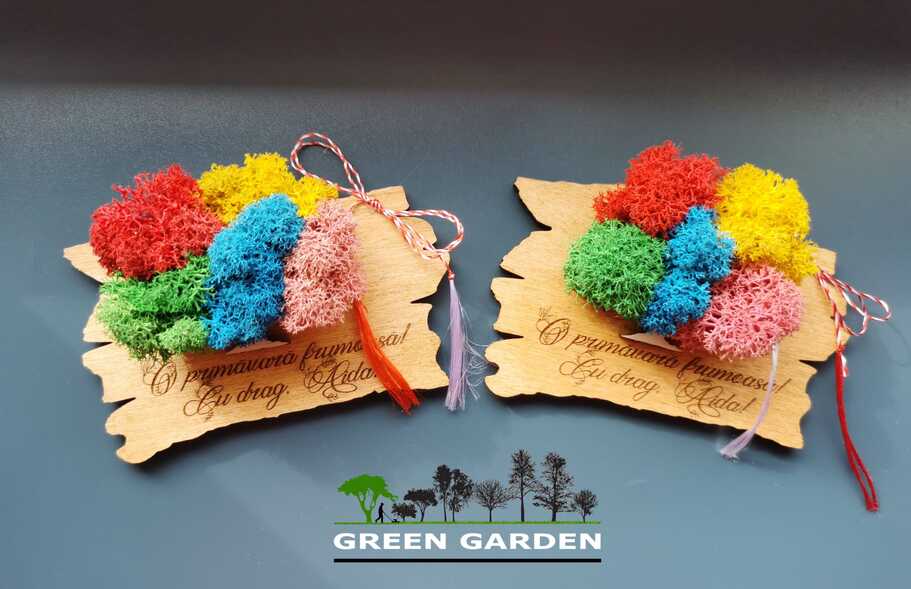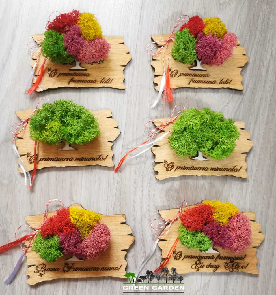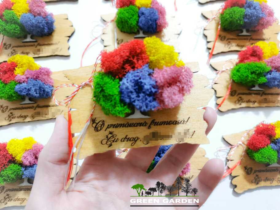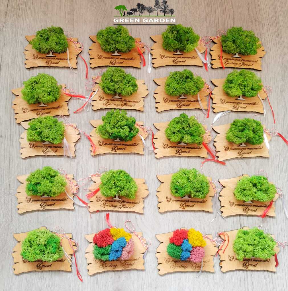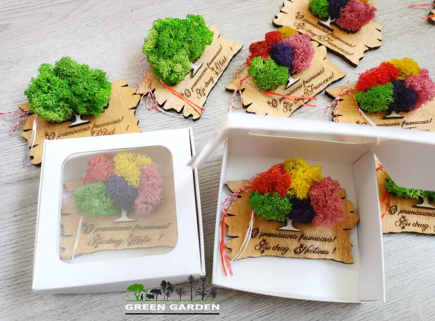 Martisor magnetic personalizat cu text si copac cu licheni stabilizati